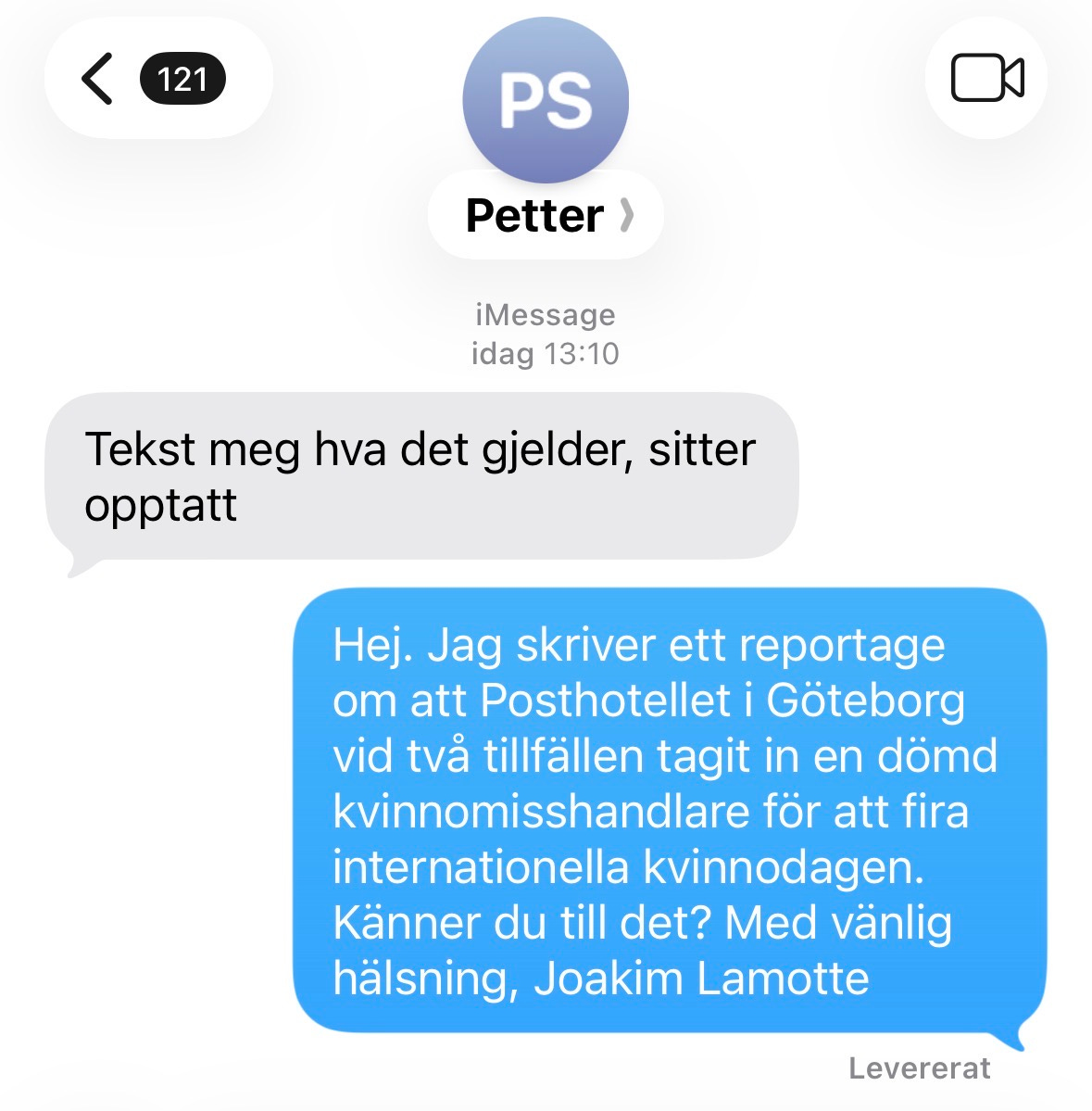 Eftersom Petter Stordalen är en hyvens kille pratar han säkert med hotellet så att jag kan få svar på om man kände till domarna mot Fredrik Koch och hur man ser på att en person som dömts för våld mot kvinnor leder event för kvinnor i samband med internationella kvinnodagen.
