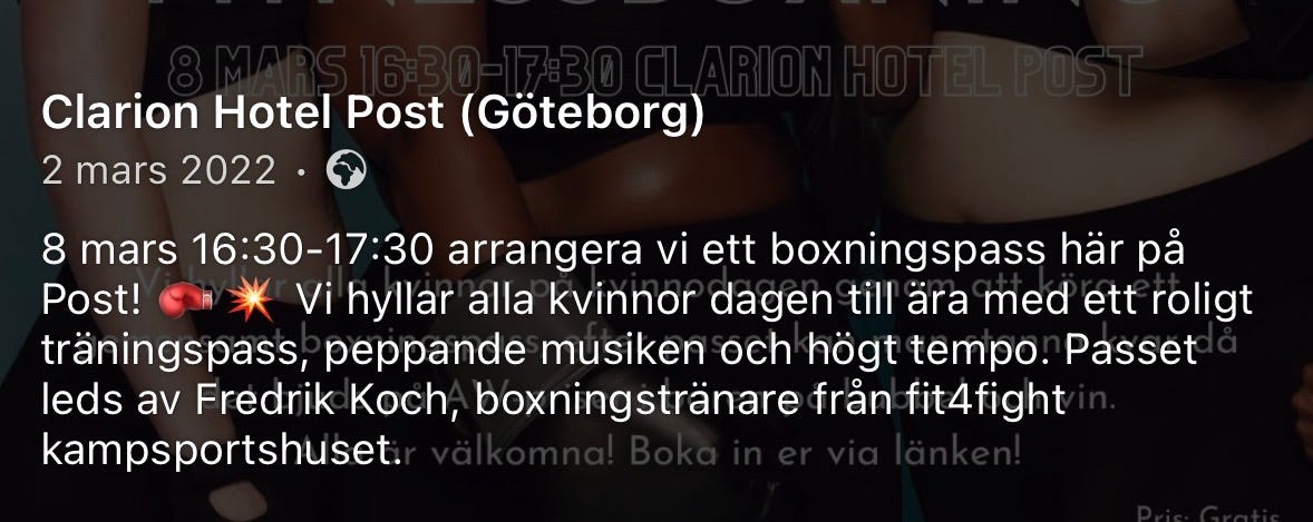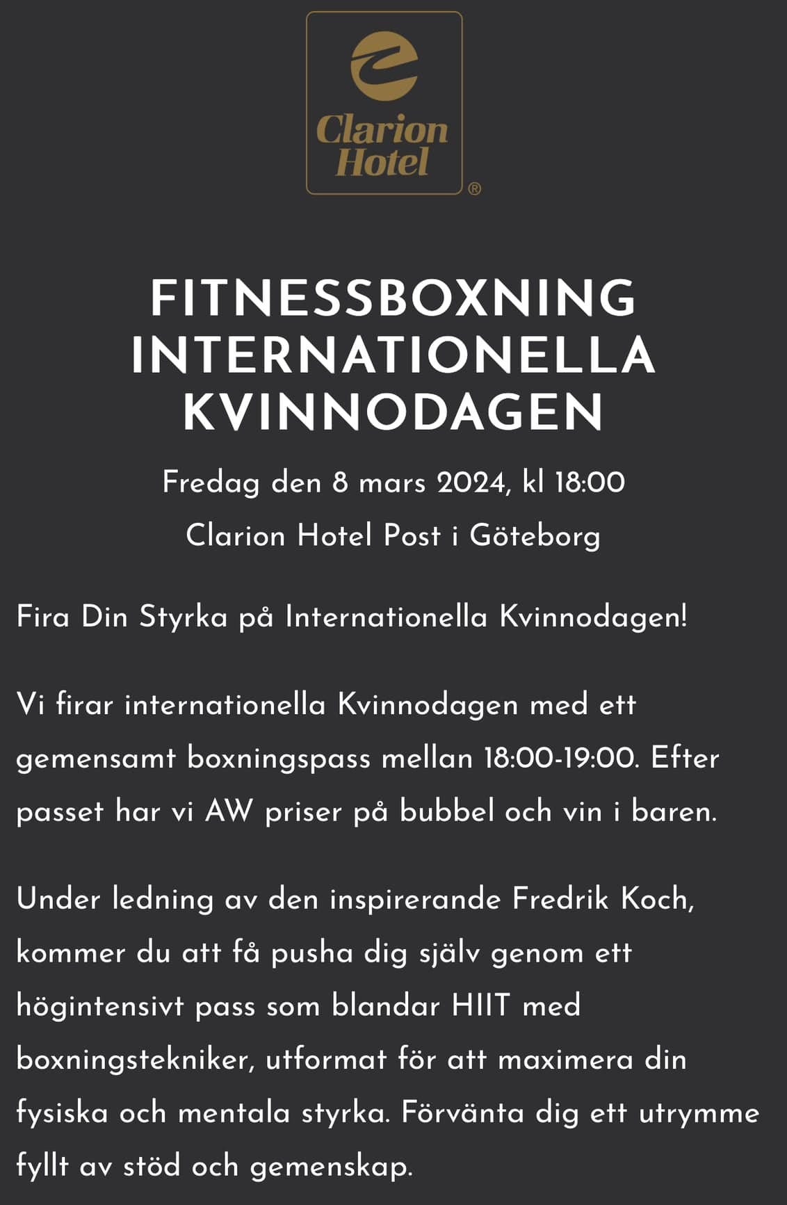 Redan 2022 och 2024 marknadsförde hotellet kvinnodagsevent där deltagare erbjöds boxningsträning under ledning av Fredrik Koch. Tillställningarna presenterades som ett sätt att uppmärksamma internationella kvinnodagen och uppmuntra kvinnor att stärka både kropp och självförtroende. I hotellets marknadsföring framhölls att eventen skedde “under ledning av den inspirerande Fredrik Koch”.