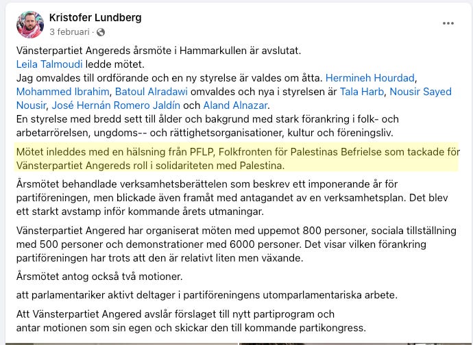 “Mötet inleddes med en hälsning från PFLP, Folkfronten för Palestinas Befrielse som tackade för Vänsterpartiet Angereds roll i solidariteten med Palestina.”