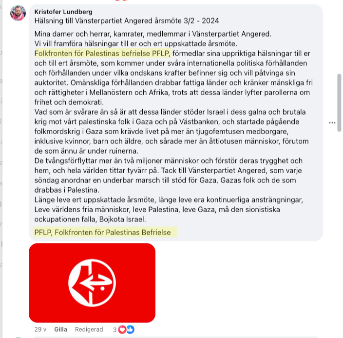 Jag kan idag avslöja att PFLP har så pass nära band med Vänsterpartiet att man skickar hälsningar och tackar för hjälpen inför partiets medlemsmöten.